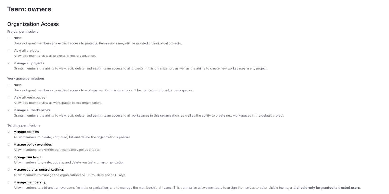 Note: Removing these permissions has the impact that all users in these Teams will not be able to create, edit, or delete policies, projects, workspaces, and VCS settings. Additionally, you cannot remove these permissions from the owners group. To reduce admin count on owners, remove users from the owners team.