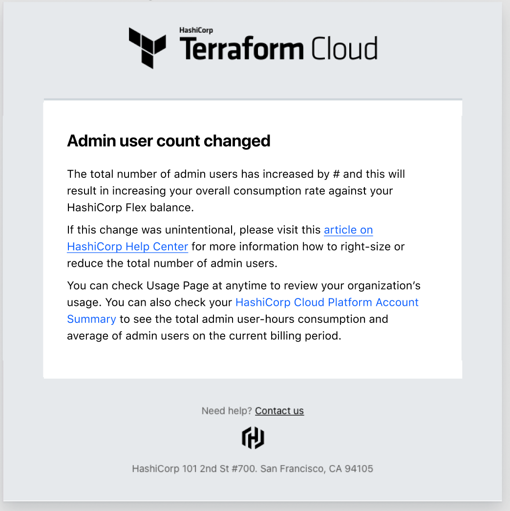 Note: The HCP Billing account may be connected to one or more Terraform Cloud Business Orgs. This email will therefore go out to each Org, regardless of whether it did or did not add admin users.