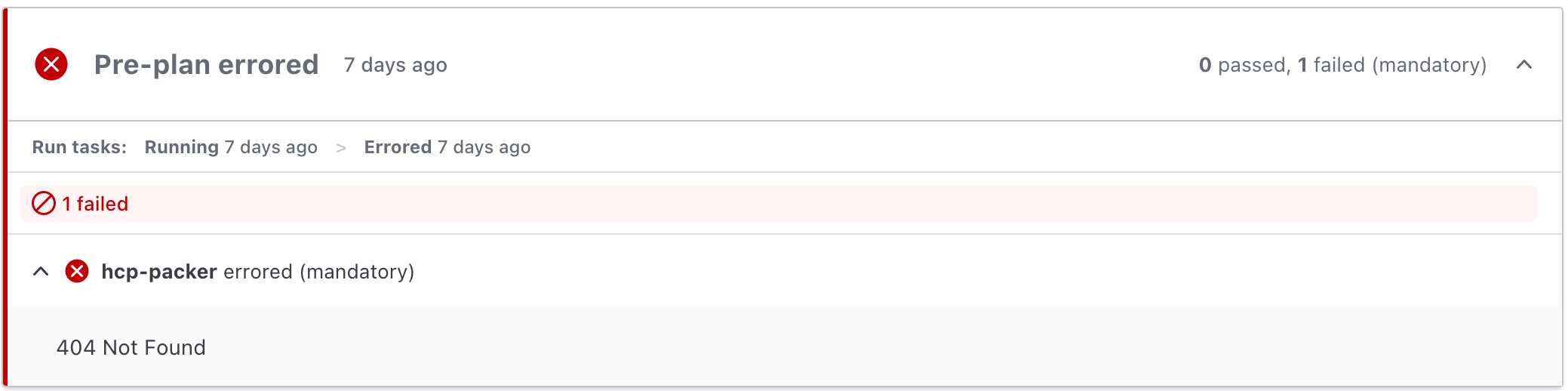 After setting up TFC run task for HCP Packer as a pre-plan task, you may receive a 404 Not Found error as shown below: